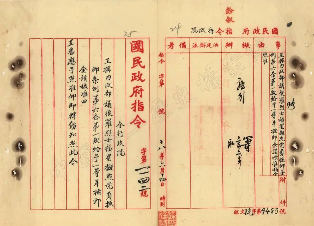 1929年6月13日国民政府为准予烈士罗福星一等年抚恤金事致行政院指令(中国第二历史档案馆藏)