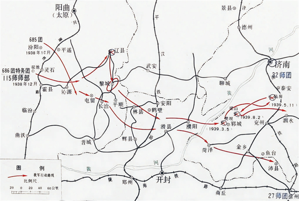 ▲八路军第115师挺进山东作战行动要图(1938年12月至1939年8月)。 资料图片
