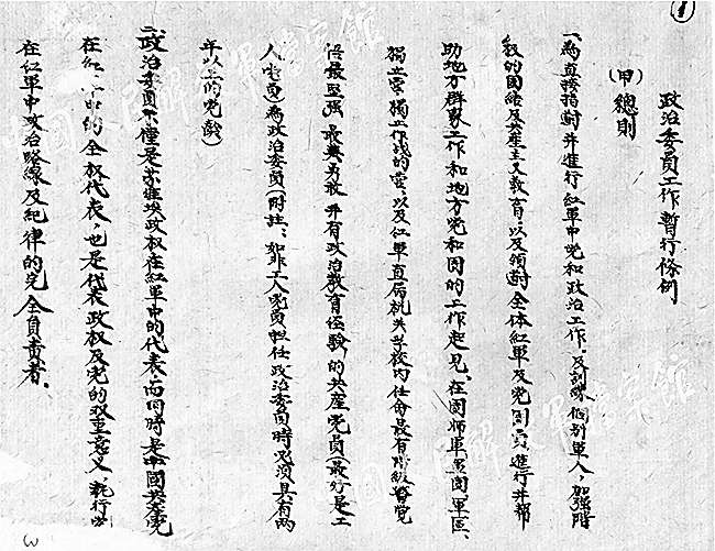 1938年初,在此背景下诞生的《国民革命军第十八集团军政治工作暂行条例(草案)》(以下简称《条例》),开宗明义地宣告:“抗日战争是一种民族自卫的革命战争,政治工作是这一民族抗战军队的‘生命线’!”