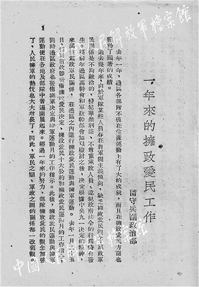 人民军队来自人民,服务于人民,自诞生之日起,便将“拥政爱民”融入血脉。1944年3月,八路军留守兵团政治部编印的《一年来的拥政爱民工作》,如今珍藏在解放军档案馆。这份文件用近2万字对部队拥政爱民工作进行细致分析,让我们看到了当年部队对群众工作的高度重视和其背后的良苦用心。