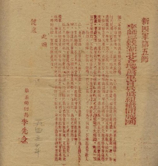 1938年10月武汉沦陷后,中国共产党领导的鄂豫地方武装在敌后浴血抗战,逐步发展壮大为新四军第五师(以下简称五师)。这支英雄部队长期孤悬敌后、远离主力,深陷日伪顽三方夹击的困境。在李先念师长的率领下,五师创造性运用统一战线这一法宝,广泛团结工农群众、开明士绅、国民党中的爱国人士等进步力量,在复杂斗争中凝聚抗战合力。湖北省档案馆保存的一组档案,真实见证了五师在敌后抗战的艰苦环境中,打破孤立无援的困局,持续壮大抗日力量,拓展敌后抗日根据地的艰辛历程。