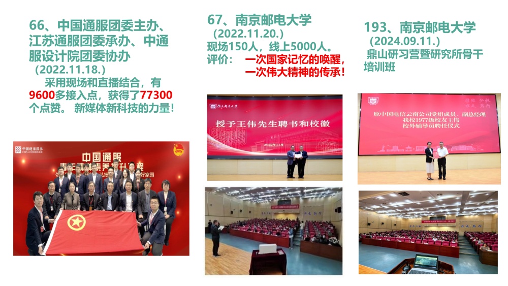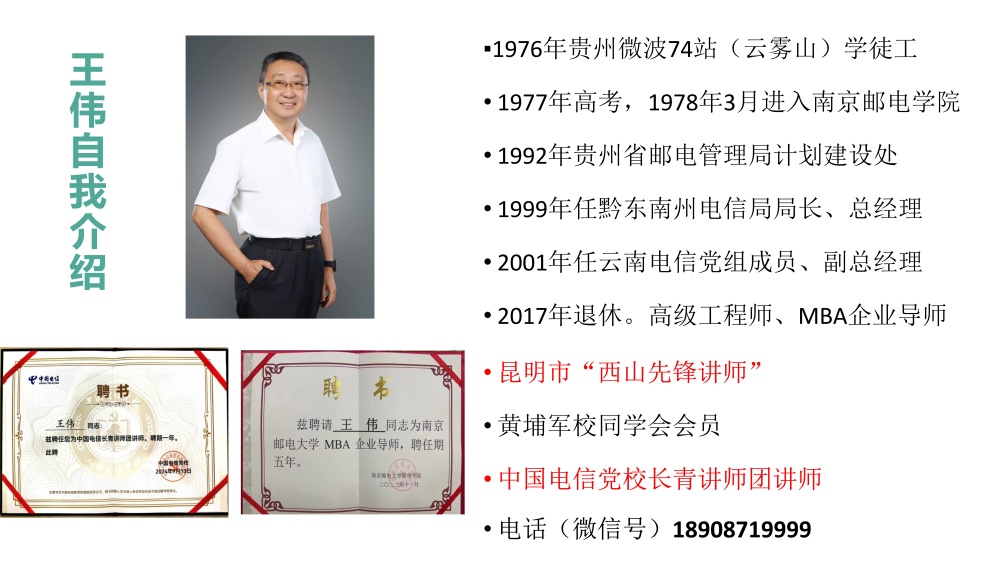 王伟先生有着扎实的成长与工作履历:1976年任贵州微波74站(云雾山)学徒工,1977年参加高考,1978年3月进入南京邮电学院学习;此后深耕通信行业多年,1992年任职于贵州省邮电管理局计划建设处,1999年任黔东南州电信局局长、总经理,2001年任云南电信党组成员、副总经理,为通信事业发展作出积极贡献。退休后,他以高级工程师、MBA企业导师、昆明市“西山先锋讲师”、中国电信党校长青讲师团讲师等多重身份,投身公益宣讲与历史抢救工作。