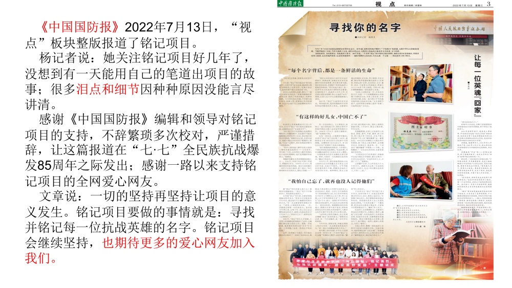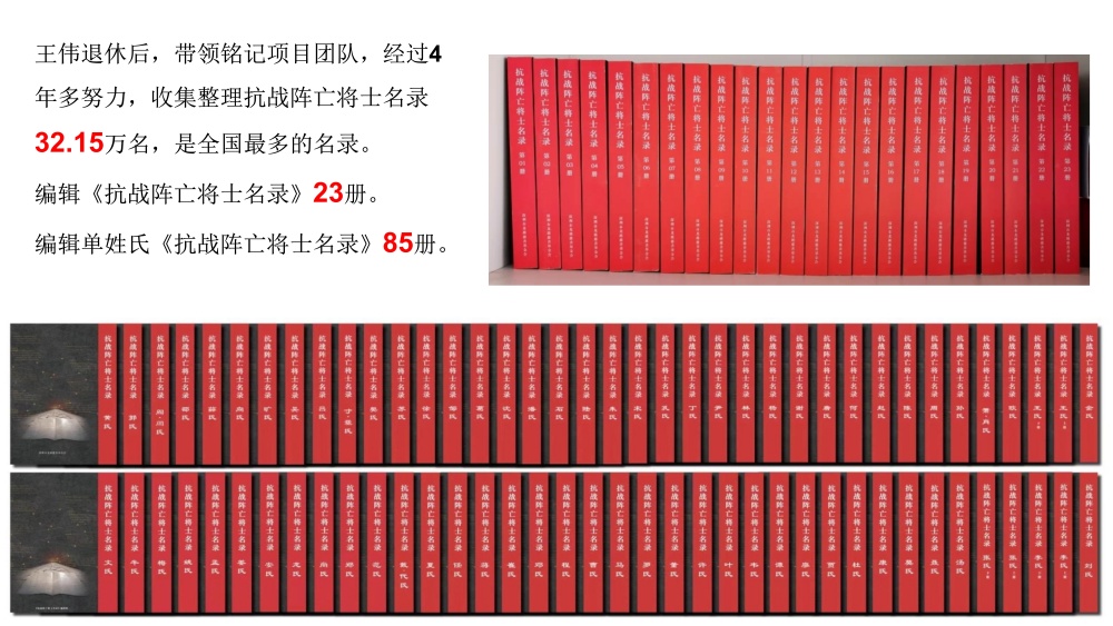 为让抗战英烈英名永垂不朽,王伟带领铭记项目团队,历时4年多潜心收集、整理、校对,收录抗战阵亡将士名录达32.15万名,为全国规模最大的抗战阵亡将士名录汇编成果。团队先后编辑印制《抗战阵亡将士名录》23册、单姓氏《抗战阵亡将士名录》85册,用文字为千万无名英雄立传,让民族记忆得以完整留存。