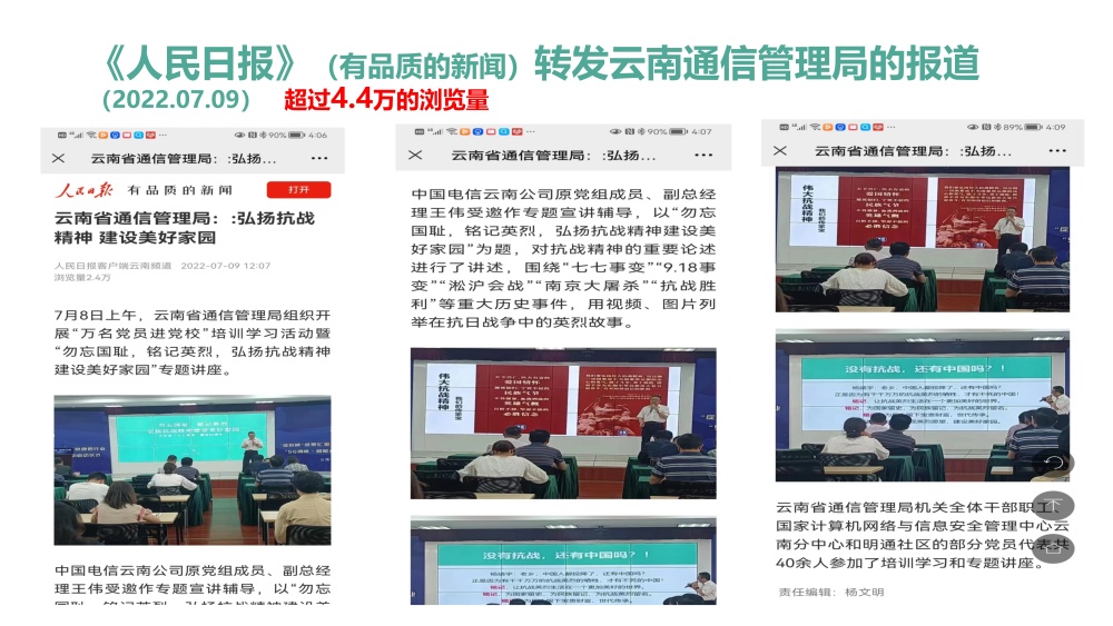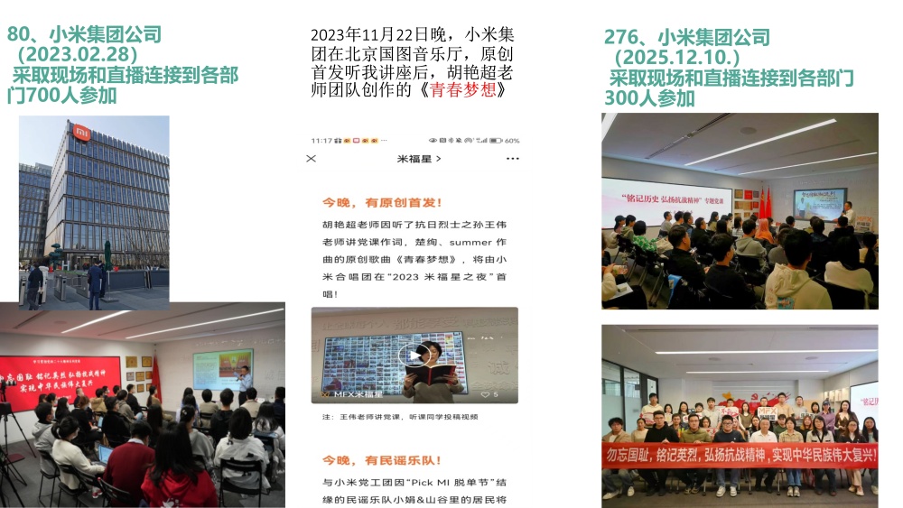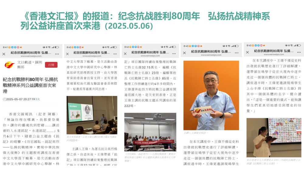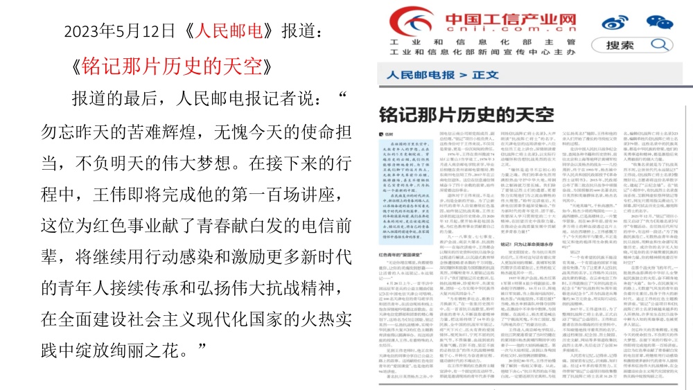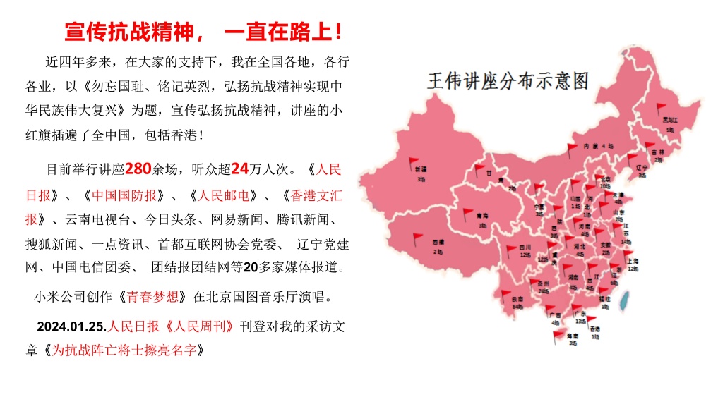近四年来,王伟走遍全国多地、深入各行各业,以《勿忘国耻、铭记英烈,弘扬抗战精神实现中华民族伟大复兴》为主题开展公益讲座。截至目前,累计举办讲座280余场,覆盖听众超24万人次,用鲜活史料与真挚讲述,点燃大众爱国热情,传承伟大抗战精神。其事迹先后被《人民日报》《中国国防报》《人民邮电》《香港文汇报》、云南电视台、今日头条、网易新闻、腾讯新闻、搜狐新闻、一点资讯、首都互联网协会党委、辽宁党建网、中国电信团委、团结报团结网等20余家主流媒体与平台报道,引发广泛社会反响。