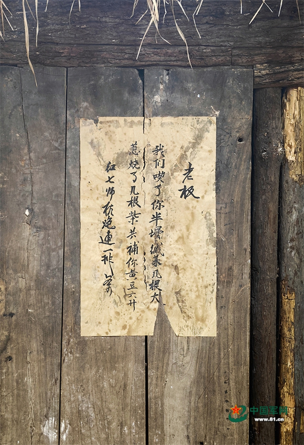 这天,饥肠辘辘的红七师机炮连一排官兵在经过一个村庄时,准备架锅做饭,稍作休整。他们想向老乡买些粮食,却见不到一个人影。无奈之下,官兵走入村民黄堂珍家中,找到半坛咸菜和几根大葱,将就着做了一顿饭充饥。临走前,他们给水缸挑满水,将屋子打扫得干干净净,还留下6升黄豆作为经济补偿,并在门板上贴了一张字条说明情况。