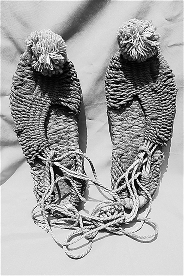 △谢志坚长征途中穿过的绣球草鞋。中央红军长征出发纪念馆藏