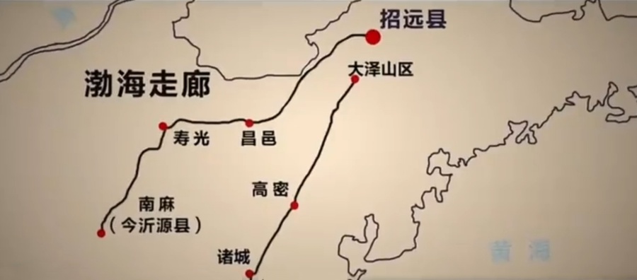 受日伪顽封锁和“扫荡”制约,不同时期的运金路线差异很大。1939年至1943年,运金主要是通过“渤海走廊”,即从胶东根据地出发,经昌邑、潍县、寿光三县北部,向南穿过胶济铁路进入鲁中区,然后到达滨海区山东分局驻地。这条路线巧妙地避开了日伪据点密布的胶济铁路东段,敌人控制相对薄弱,便于运金藏身。“渤海走廊”虽然相对安全,但路途遥远,从胶东区到滨海区绕了一个大圈子。1943年7月,在山东军区的统一指挥下,鲁中军区和滨海军区部队,分别挺进诸(城)日(照)莒(县)一带山区,由此打通了鲁中区和滨海区的联系,“滨海通道”应运而生。1944年秋后,运金路线由“渤海走廊”改为“滨海通道”,即从胶县、高密境内越过胶济铁路,经滨海区诸城等县直达山东分局所在地。“滨海通道”打通后,运金距离大大缩短,从胶东区到山东分局驻地,只需两天即可到达。