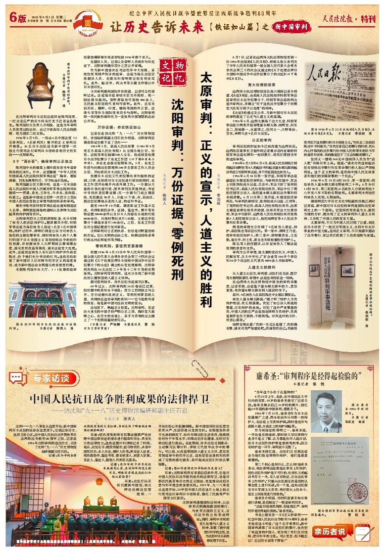 沈阳——九一八事变从这里开始,新中国审判日本战犯的槌音在这里落下。它铭记着历史,也捍卫着公正。在中国人民抗日战争暨世界反法西斯战争胜利80周年之际,记者就1956年沈阳审判的这段历史,采访了沈阳“九·一八”历史博物馆编研部副主任石岩。