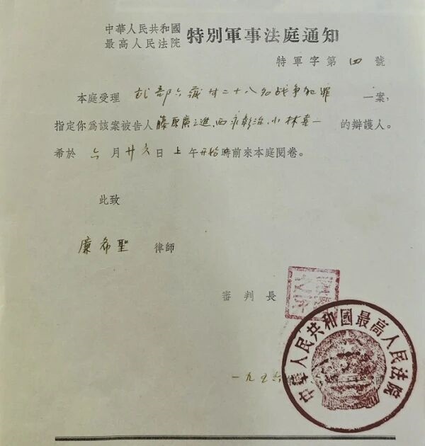 图为特别军事法庭向廉希圣发的阅卷通知。 曹旭 摄