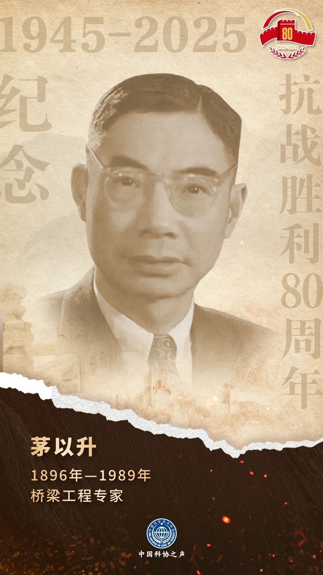 值此中国人民抗日战争暨世界反法西斯战争胜利80周年之际,我们推出【抗战中的科学家】专栏,深切缅怀那些峥嵘岁月中以科学救国的英雄们。他们的精神跨越时空,激励着今天的我们在民族复兴的新征程上继续前行。本期我们为大家介绍其中的代表人物:茅以升。