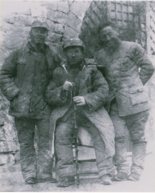 1938年,高士其(中)与李公朴(右)在延安窑洞前