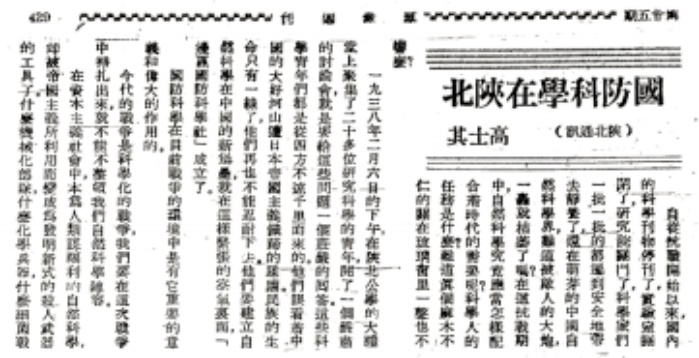 1938年,高士其发表的《国防科学在陕北》一文。