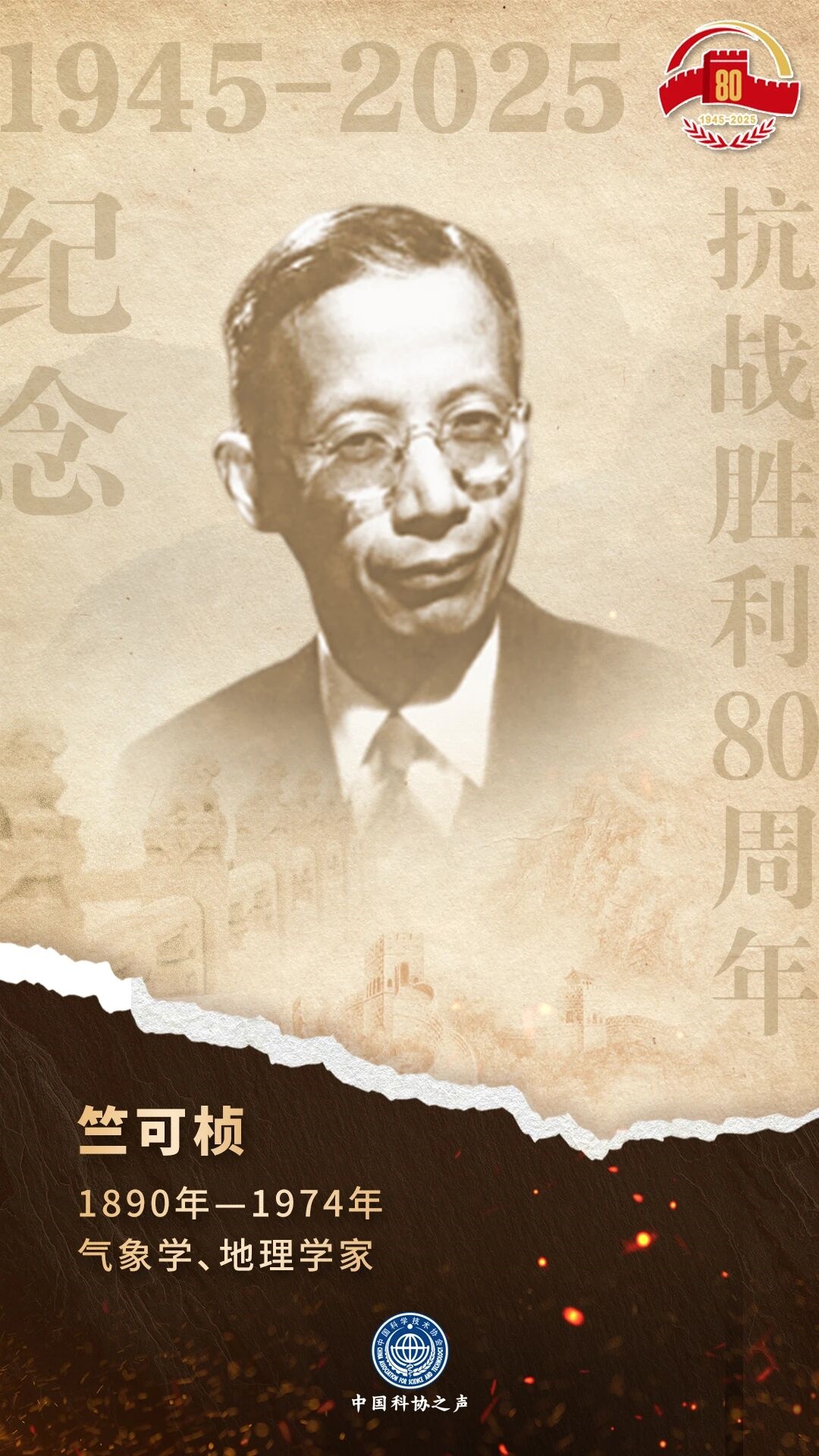 值此中国人民抗日战争暨世界反法西斯战争胜利80周年之际,我们推出【抗战中的科学家】专栏,深切缅怀那些峥嵘岁月中以科学救国的英雄们。他们的精神跨越时空,激励着今天的我们在民族复兴的新征程上继续前行。本期我们为大家介绍其中的代表人物:竺可桢。