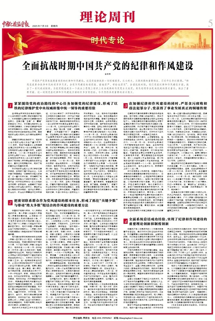 中国共产党历来高度重视党的纪律和作风建设,这是党能够战胜一切艰难困苦,从小到大、从弱到强的重要保证。习近平总书记强调,“特别是在革命战争年代的艰苦岁月里,全党作风建设标准很高、措施很严、考验也很实”。全面抗战时期,我们党在纪律和作风建设方面,做出了一系列成功探索,为把党锻造成为一个政治上思想上组织上走向成熟的马克思主义政党,肩负起领导全民族抗战的历史重任,做出了重要贡献。这一时期党在纪律和作风建设方面的许多宝贵经验,今天仍然具有重要的启示意义。