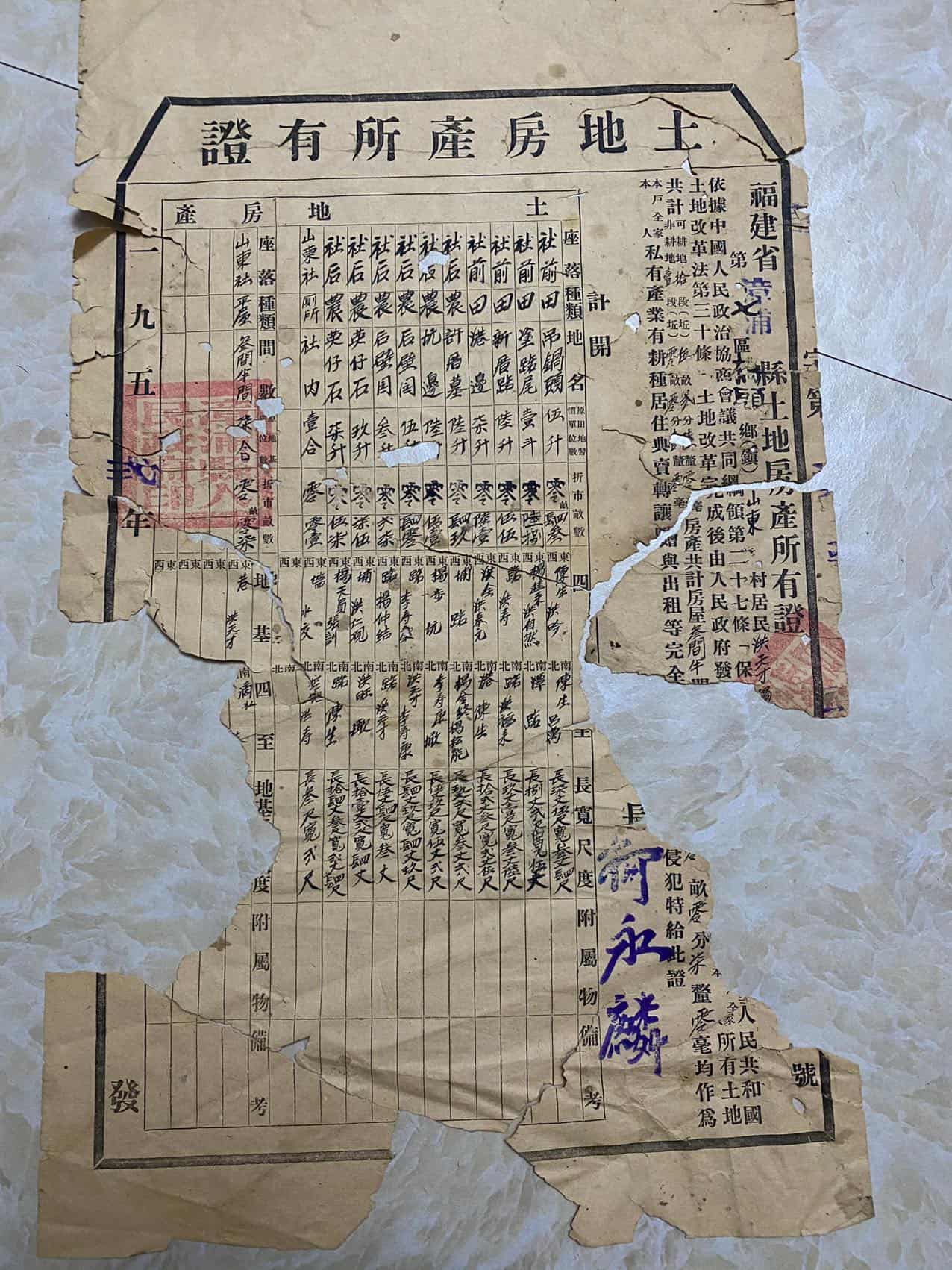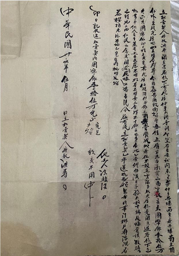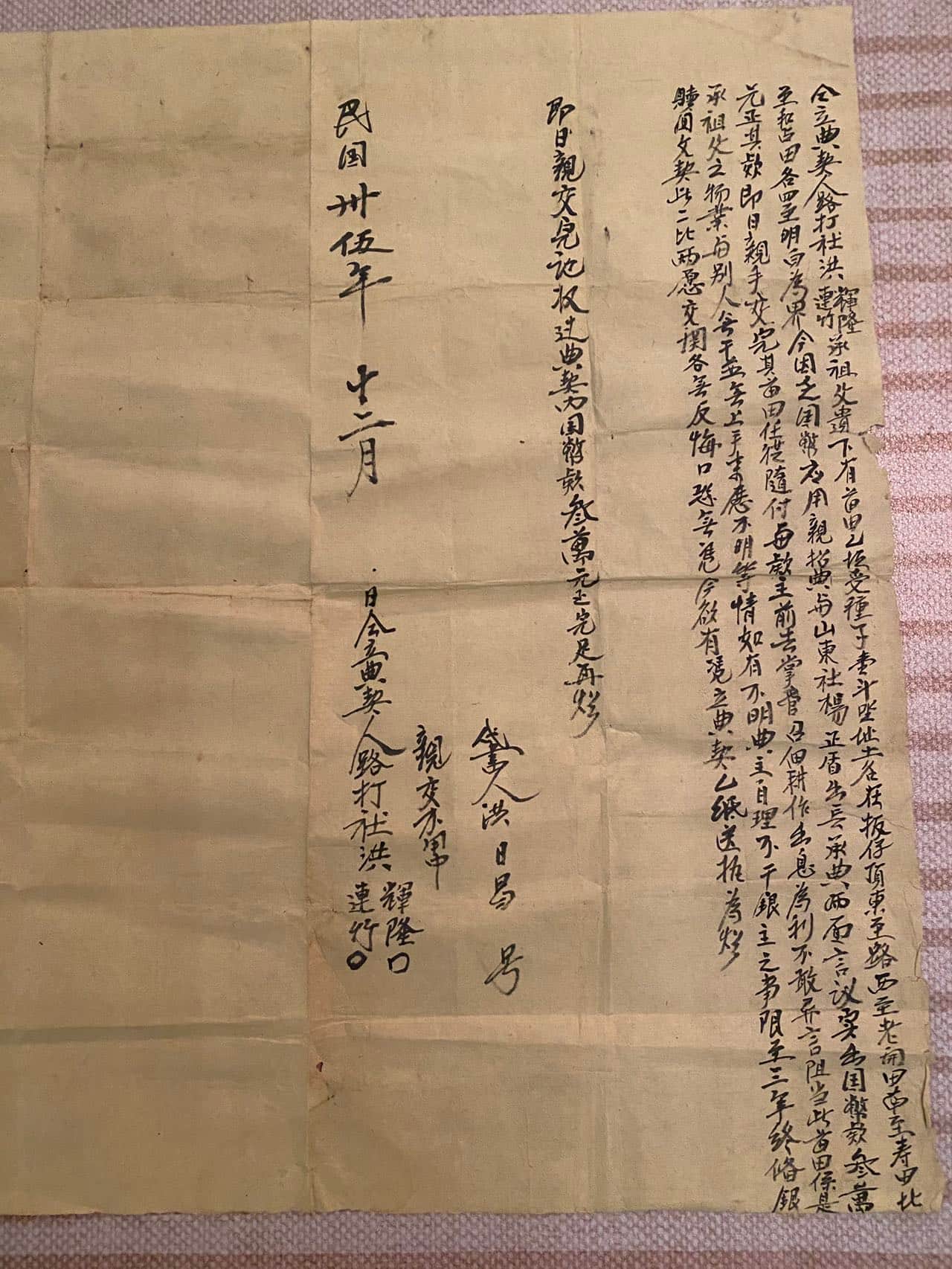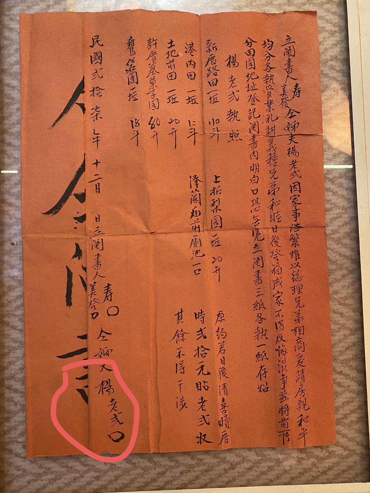 图一为洪瀼的肖像照,虽年代久远,仍能看出她眉目间的善良、坚韧大义的女性。她生于福建漳浦杜浔镇山东自然村。洪锣之女,洪瀼从小知书达理,学过中西医。成年后父母双逝,洪镶肩负抚养两个弟弟,二弟洪寿、三弟洪每发。时逢战乱,三弟当壮丁,从此家中便剩下洪瀼跟年幼胞弟相依为命,洪瀼成年后招杨家老貳当上门婿。图二是杨正盾父亲跟房叔胞弟洪寿的分家契约。婚后洪瀼跟杨老貳育有三个子女:长女洪漫从小过继给古雷西林好友抚养,二女杨曼,三子杨正盾,家中只剩下二姐杨曼跟三弟杨正盾。