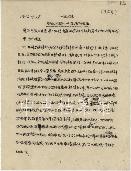 1940年9月28日:贺龙、关向应关于第二阶段同蒲战斗的初步总结给前总、军委的电报(1)