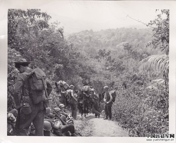 这一天终于来到了,我们一切都准备好了。一列摇晃的、滚动的火车把我们载到离缅甸边界附近大约8英里的一个小镇雷多。补给品在等着我们;骡子和马正在有栅栏的田野里奔跑;在简易的飞机跑道上准备运送补给物资。1944年2月7日黄昏时分,人们和动物们纷纷排成一队,沿着雷多公路前进,这是一片40英尺宽的崎岖土地,从印度一直延伸到缅甸,并与日本切断的著名滇缅公路相连。这就是这次行军的原因:日本希望切断印度和中国之间的联系,这条生命线可以把源源不断的物资源源不断地输送到被围困的中国,最后这条路线变成一股洪流。在我所能看到的前方,是那些戴着绿色头盔的人摇摇晃晃的脑袋,他们的背上骑着绿色的背包。骡子们一路奔驰着,他们的背包随着行军的脚以有节奏的动作从一边向另一边摇晃。在缅甸的月光下,白茫茫的脸庞在我身后一个接着一个出现消失。谈话一波三折。匹兹堡中士索科洛夫斯基(Sokolowsky)说:“我希望这件事很快就结束了。我觉得这不会是一次短途旅行。”但有十个晚上,没有什么可以证明他的感受。所有的东西都在行进。天亮的时候,我们离开了公路,在丛林中扎营,直到日落。137英里的时间里,我们只被100辆卡车车队的尘土惊扰,他们正呼啸而过,为中国军队攻击缅甸北部的日军提供了条件,透过错综复杂的藤蔓、榕树和青草的光线,还不足以让两英尺远的地方看到一棵树。
