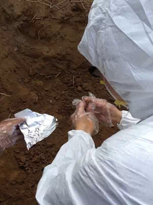 现场发现了阵亡者的牙齿,陈老师摸着牙齿的顶部,“牙齿磨损度很低,初步判断年龄在20~25岁”。那一刻我的心情沉重,在40多度的高温下穿着防护服戴着口罩捂得严严实实的陈老师脸上不断有汗珠滚落,我看到她眼镜背后滑落的是泪水......