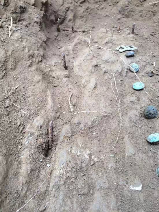 我仔细清理了两具遗骸周围的钉子,这次没等工人拔,当他们的铲子一碰到钉子就让暂停,自己动手清理,终于找到自己想要的答案。如上图,钉子排列较密,围着遗骸一圈,标示出遗骸的长宽高,在四个转角处会分别用两颗钉子标示。