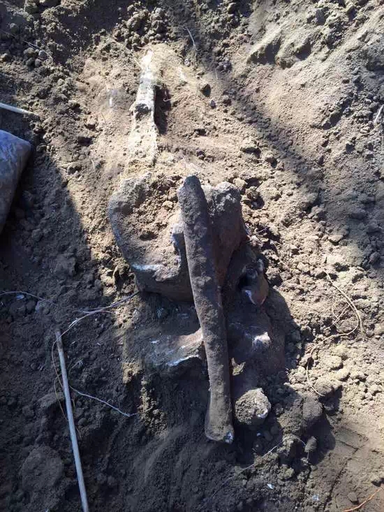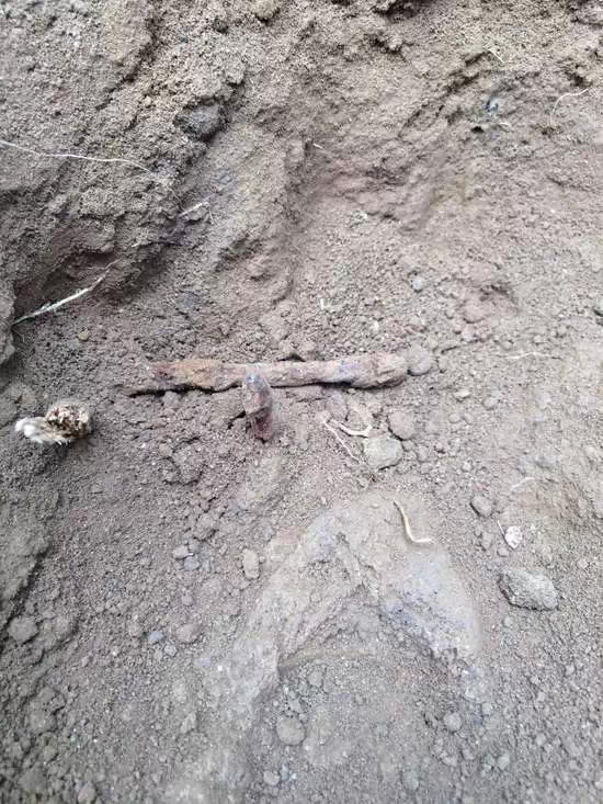 另外一个很有意思的发现是这具遗骸,同样是移葬,但他有一节肢骨搭在头上,看上去就像在敬礼,是当年安葬他的战友专门摆放成这样的,还是无意中就放成了这样,无从得知。