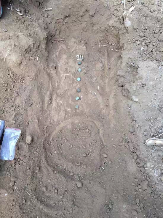 这个葬坑还有新的发现,六粒扣子和一个绊扣,摆放位置如图,圆圈是头骨摆放的位置。似乎在躯干骨和四肢骨的上方放有一件衣服。
