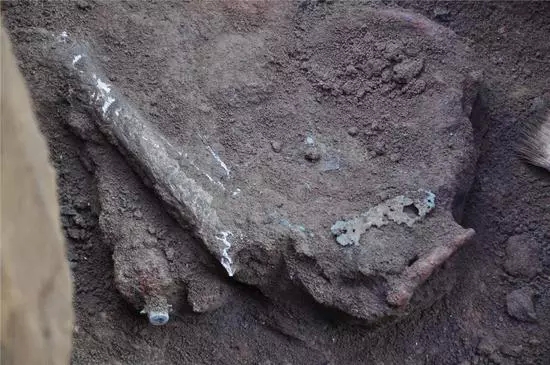 清理时,竹签在腿骨的下方探到一块很硬的东西,慢慢清理开来,发现是一块较大的金属物,头部有铜质的盖子。