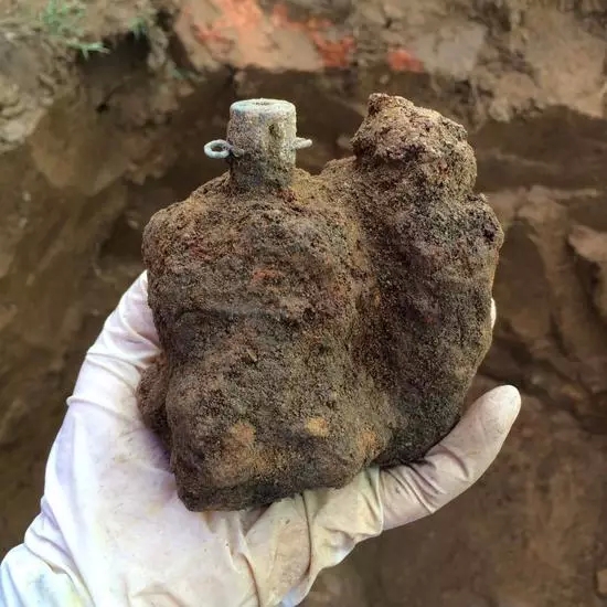 将压在上方的遗骸清理收殓后,这块金属物终于完整出现在眼前,我小心的取出仔细观看,似乎是手雷,身上已锈迹斑斑、但顶上的铜质保险栓还在,旁边的铁块猜测也是手雷,但两个手雷已经融为一体了,曾看过多起战时遗留弹药爆炸伤人的事,不敢胡乱鼓捣,小心翼翼的将它装入密封袋放入箱内保存。