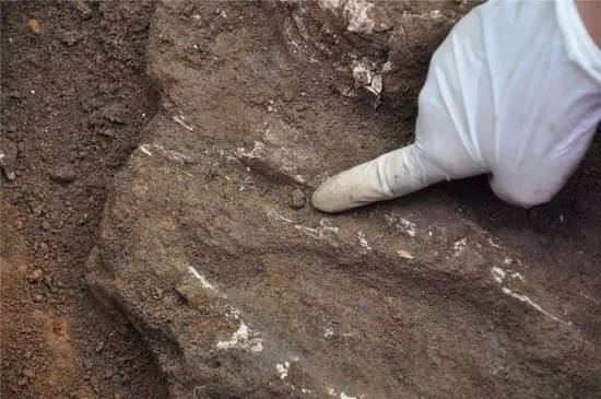 今天发现的第一具遗骸保存较好,移葬。鞋已经腐化得差不多了,钉在鞋底的铁掌还在,鞋子的轮廓还能看清,脚掌的骨头已化成了土,还能看出白色骨头的痕迹,但已没法和泥土区分开来,只能一同装入密封袋中。
