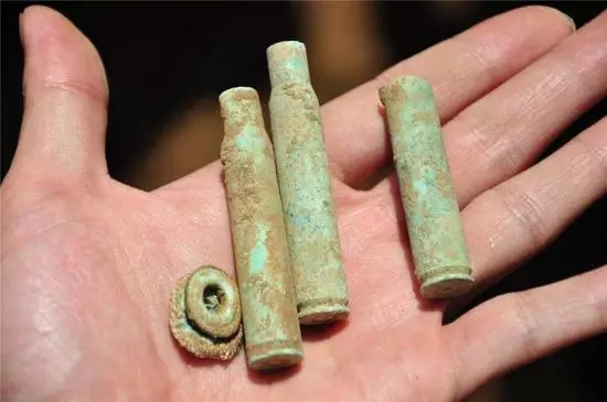 在另一个葬坑,工人发现了几枚发射过的弹壳和一些帆布上的铜环,根据以往的经验,下面应该就是遗骸了,看了看现场,让工人将周边的土清理掉,露出土包方便我们待会收殓,一再嘱咐他们要慢,要小心,不要破坏到遗骸。