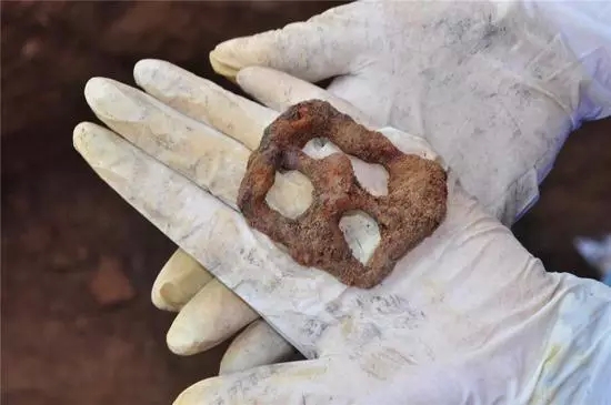 没多久,工人们便按我的要求将挖出了土包的形状,我小心的一层层将上面的土清理掉,没多久便发现一个皮带扣,能清晰看见搭在上面的扣针。