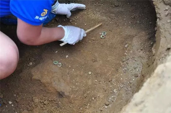 围墙下被工人们清理出一个半米深的洞,锄头敲在鹅卵石和水泥混合物地基上的声音一直回荡在耳旁,工人小心翼翼的问我还要不要再继续往前挖,再往前,就是马路了,我失落的说不用了……没有遗骸,从地基到发现铜环的距离来判断,很可能在当年修建围墙的时候遗骸就被破坏,剩下的铜环是包裹遗骸底部的帆布上遗留下来的。
