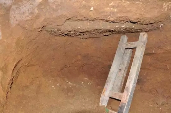 中午的时候,我们在之前发现四个头骨的葬坑旁又发现了一个葬坑,因为葬坑上方是屋子的排水沟,没法直接从上部进行发掘,只能从侧面打洞。