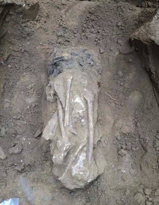 但非常奇怪的是紧贴着遗骸西面有一堆被烧过的残骸,最开始我们以为是木炭,但清理出来后发现是被烧得炭化的残骸及骨灰。