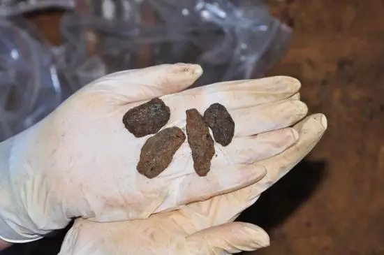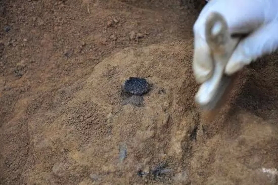 可以看到,骨灰也是被钉子标记在遗骸圈内的,可为什么会有骨灰呢?如果是火化为什么不将遗骸全部火化而只火化其中一部分?是因为这名士兵在战场上被击中,有一部分肢体被战火烧伤?在炭化的残骸及骨灰里我们还发现有金属残片,是击伤他的弹片吗?一个又一个的问题在脑海中回荡,没有答案。