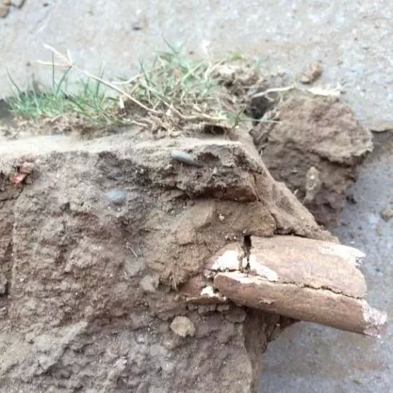 从图片就可以看到,非常浅,零乱的残骸几乎贴着地表出现。在清理完上层的遗骸后,工人继续往下挖,下面的土质不同,但没有遗骸,猜测是当年修建房屋时葬坑被破坏过。而在这片墓地上,原本应该整齐排列的葬坑很多是空的,遗骸不知所踪。