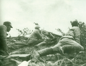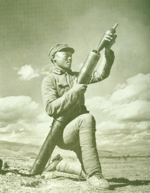 战死日军身上远征军脚穿草鞋的士兵,用重机枪向敌阵地射击。