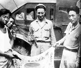 据说美国士兵特别喜欢战利品,只要是日本人的东西,水壶,帽子或大刀,太阳旗,他们都小心地珍藏,日后回国挂在自己的客厅里或卧室里作为人生经历的证明。一面太阳旗据说可以换到5条美国香烟。这张照片显然是应记者的要求拍摄的,因为画面里的人物都已经设计好了自己的表情。
