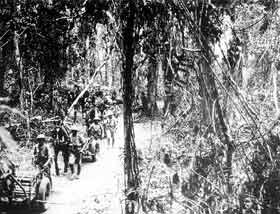 藤蔓横生的环境展示了缅北原始森林的面貌,一支庞大的军队在这样的森林里是很容易消失的。在这样的森林里作战解决给养最有效的工具是马车。这些马比本地的马要显得身材高大,显然它们是被军队挑选出来服役的良种马。在遮天蔽日的原始丛林里和士兵们最亲密的就是它们了,从某种意义上说,战争是这些马驮出来的。