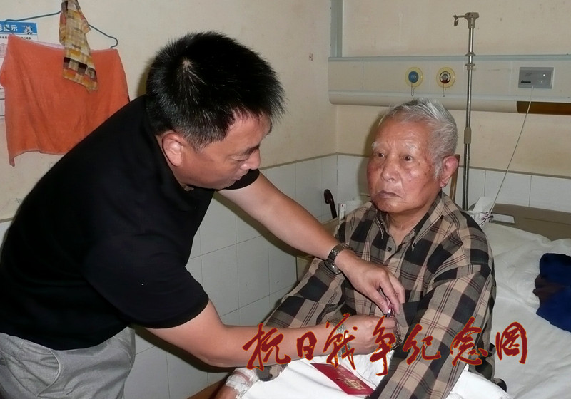 在1944年夏天的松山战役中,我们部队在进攻距保山30多公里的3号高地时,因日本鬼子的碉堡火力特猛而攻不上去。我们连队在接受夜晚突袭的命令后,利用夜幕和草丛的掩护,分几路慢慢接近敌堡,然后在炮火的掩护下,吹响冲锋号冲了上去,我们班最先占领制高点。此后我军在战斗机的配合下,以优势炮火主攻关山阵地,但久攻不下,我军死伤惨重。然后我军用了20多天时间,悄悄挖掘坑道至日军关山阵地之下,然后装进大量黄色炸药进行大规模爆破,把日军盘踞的整个山头掀了个底朝天,山上的日本守兵被全部炸死,至此松山日军的核心堡垒被我军彻底摧毁。在这次战斗中,一块炮弹片飞来,致使我头部右侧脖子受伤,因失血过多而昏迷,被抬下战场3个多小时后才苏醒过来。伤好后,我的脖子右颈部留下一道疤痕。在松山战役中,我们连战死多半,120多人只剩50多人。战后我们班受到全团通报表彰,我被提升为班长。