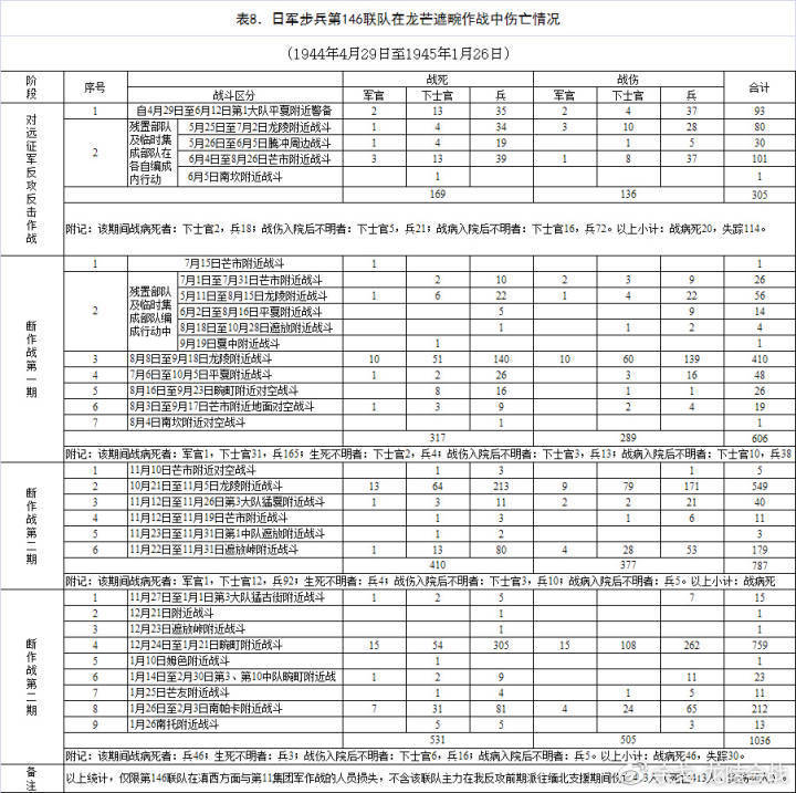 这三份档案资料,只是对“断作战”之分期与公刊战史不同,其“断”第二期作战包含了公刊战史中的“断”第二期作战和“断”第三期作战,且比前者少20余天。依据该资料中的数字合计,日军战死9190人,战伤6681人,战病死613人,战病4500人。则总计伤亡16484人(不含战病4500人)。