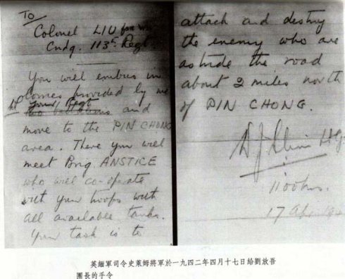 斯利姆随即颁发手令给刘放吾团长——致113团团长刘上校:兹派贵官率领贵团全部,乘汽车至平墙河地区,在该处,你将与安提斯准将会合,他将以所有战车配属你。你的任务是攻击并消灭平墙河北岸约两英里公路两侧之敌。威廉·斯利姆 1942 年4月17日上午11时。