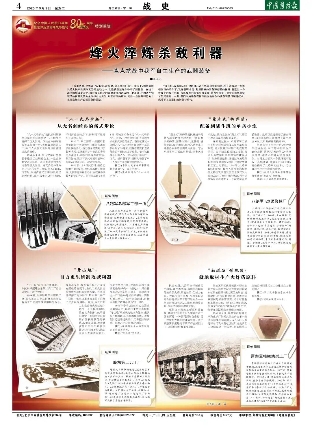 《游击队歌》里唱道,“没有枪、没有炮,敌人给我们造”。事实上,缴获武器只是人民军队获取武器的途径之一,且缴获量远远弥补不了消耗量。在抗日战争的烽火岁月中,面对极其匮乏的资源条件和落后的工业基础,中国共产党领导的抗日武装力量秉持自力更生、艰苦奋斗的精神,走出一条独具特色的自主研发和生产武器装备的道路。