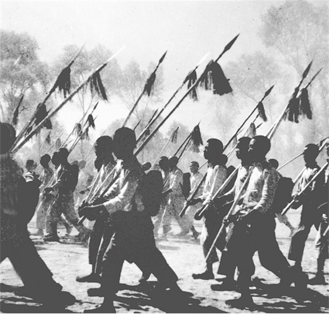 与国民党实行的片面抗战路线不同,中国共产党一开始就主张实行全面抗战的路线,即人民战争路线。图为晋察冀抗日根据地民兵在进行军事训练。新华社发(资料照片)