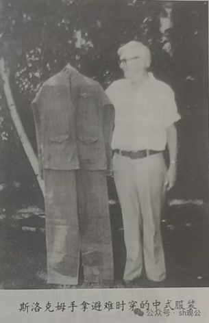 (图为斯洛克姆手拿避难时穿的中式服装。)
