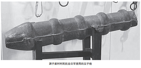 当敌人进入火力圈时,自卫队队员们点燃了五子炮。这是一种长不足1米、直径约20厘米的土炮,用铁钉、石块作炮弹,拥有5个炮核,打一炮再换上一个。炮底火眼一经点燃,炮弹便天女散花式地发射出去。炮虽不大,但能打到200米开外,炮弹落处横扫一片。炮声响后,前边的日军纷纷倒下,后面的见状拔腿就跑。敌人的第一轮进攻被打退了。