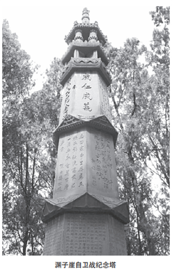 一声雷动,群山四应,渊子崖自卫战的英雄事迹很快传扬开来,极大地振奋了人们的抗战热情。1942年春,滨海专署授予渊子崖村“抗日楷模村”的光荣称号,“中华抗日第一村”的名号不胫而走。1944年,沭水县政府在该村北小岭上用紫红色的巨石,建成了一座六角七级的纪念塔,正面碑文是渊子崖自卫战简述,短短数百字,将一场惊心动魄的浴血保卫战呈现在世人眼前。背面雕刻了这场自卫战中战死的242位英烈英名,他们中有上至80多岁的耄耋老人,也有下至10几岁的青葱少年。塔的两侧是陈士榘等人和县参议会的题词,参议会的题词是:“云山苍苍,沭水泱泱,烈士之风,山高水长!”