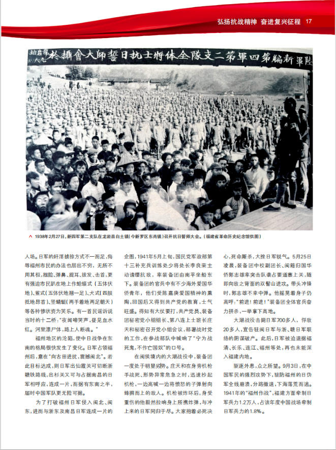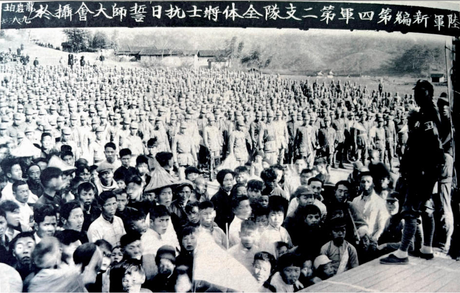 1938年2月27日,新四军第二支队在龙岩县白土镇(今新罗区东肖镇)召开抗日誓师大会。(福建省革命历史纪念馆供图)