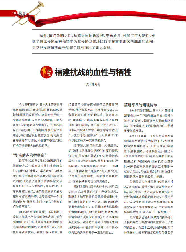 福建儿女的顽强斗争,是全国抗日大局的重要组成部分。面对民族存亡危急关头,八闽儿女不负家国,与全国各族人民一道前赴后继,用血肉之躯、铮铮铁骨谱写了一曲荡气回肠的不屈之歌。这一首民族解放的正义之歌,将永远彪炳史册,永远激励我们为推动福建跨越发展努力拼搏,激励我们为中华民族伟大复兴不懈奋斗。