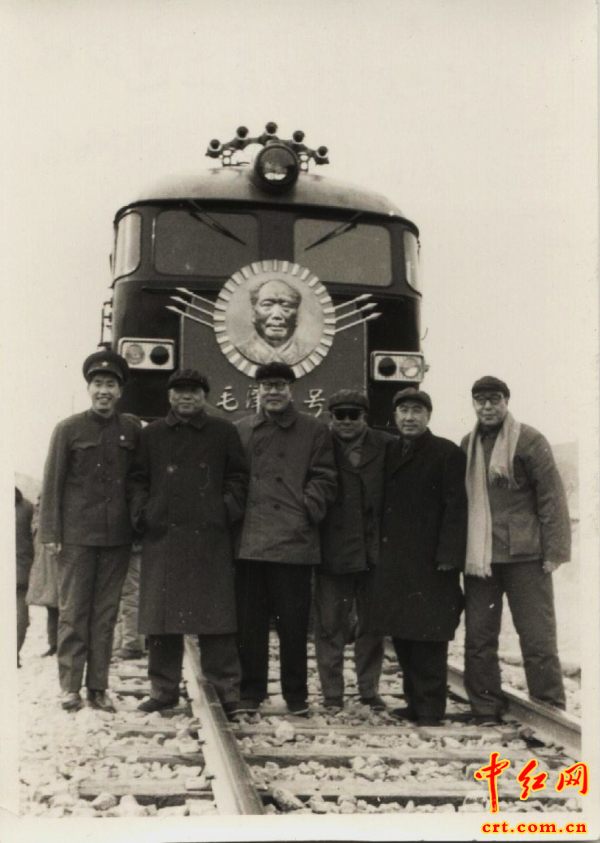 陈春森同志(右二)与铁道部领导同志和“毛泽东号”机车组成员在“毛泽东号”机车前合影