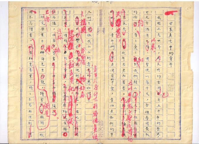 按这篇日记所描述的历史大事件推算,唐坚此时的作文、日记大部分应写于1938年前后,而此时的唐坚刚刚十八九岁,正值最好的年华却不得不经常面对敌机的轰炸,满眼山河破碎。民族的危亡与残酷的战争,迫使青年学子不得不“拿着枪和刀”,振臂高呼“把四万万散沙般的同胞团结起来”。这是一个时代不得不面对的悲壮,这是一个民族不得不奋起的抗争!